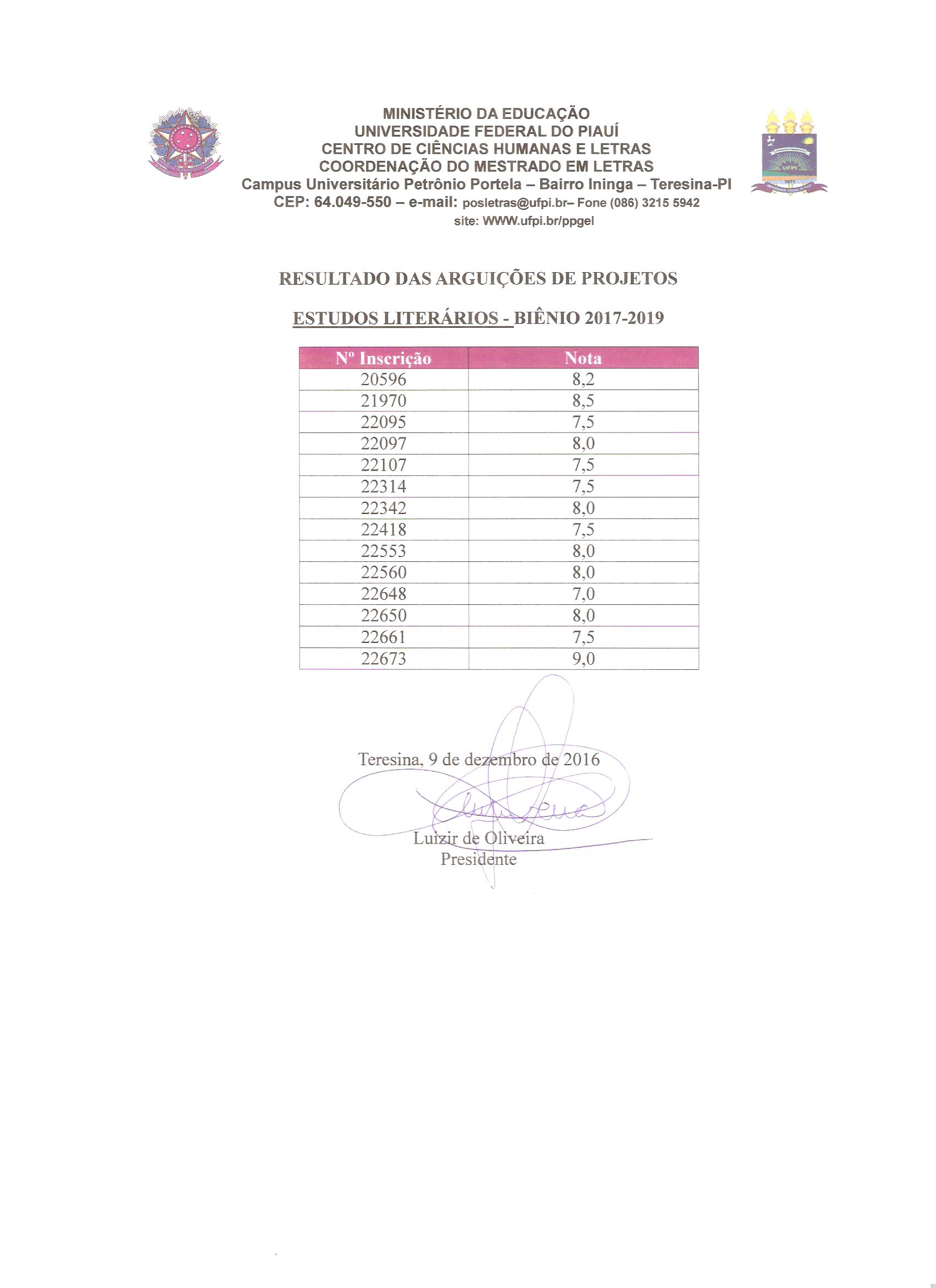RESULTADO DAS ARGUIÇÕES DO PROJETO - LITERATURA