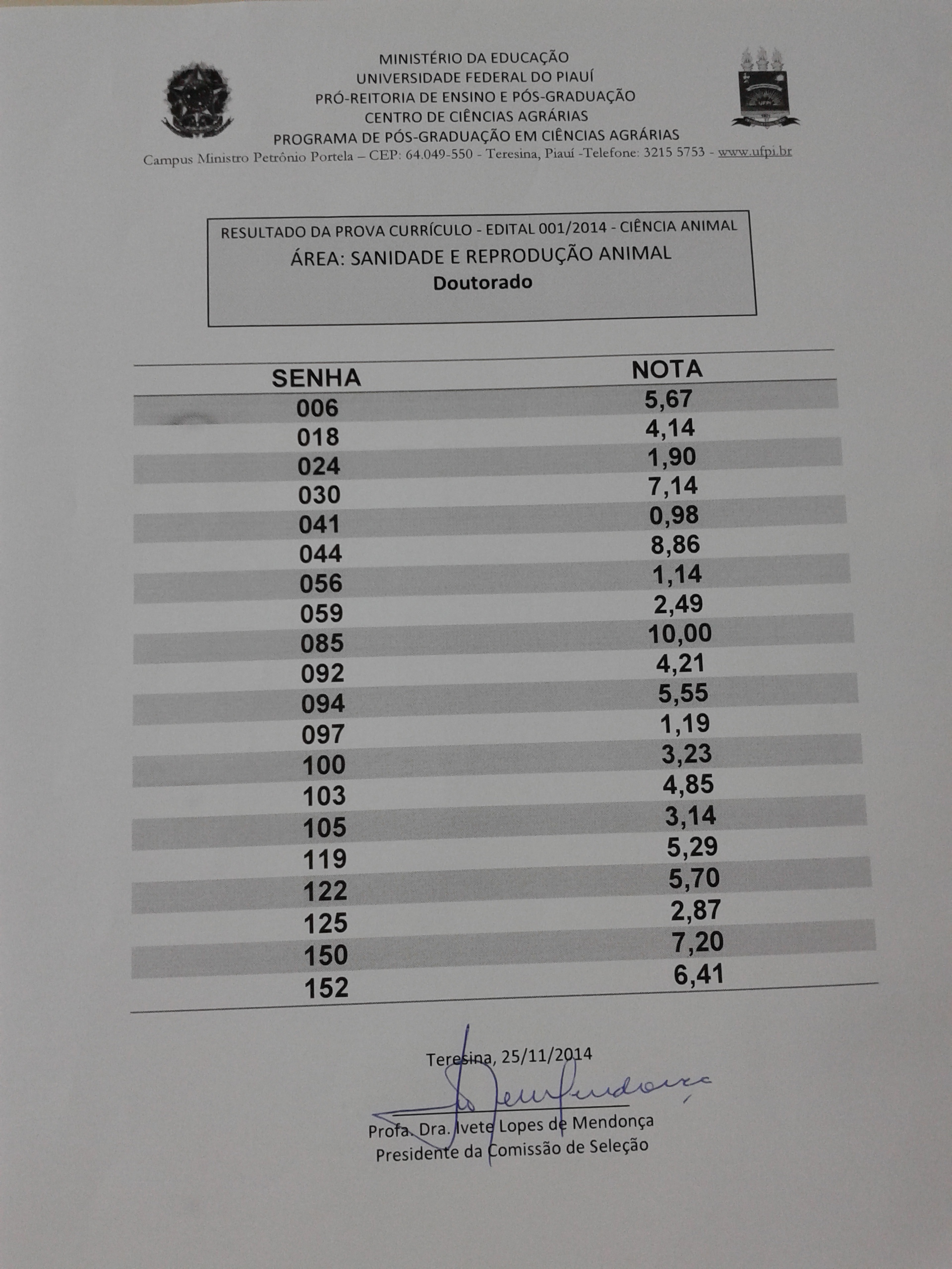 Resultado da Avaliação de Currículo - Edital 001/2014-PPGCA - Sanidade e Reprodução Animal_Doutorado