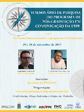 O Programa de Pós-Graduação em Comunicação da Universidade Federal do Piauí (PPGCOM/UFPI) convida a comunidade acadêmica para participar do II Seminário de Pesquisa do Programa de Pós-Graduação em Comunicação, que será realizado nos dias 29 e 30 de novembro de 2017, com o tema “Processos Comunicacionais e a pesquisa na Pós-Graduação”.