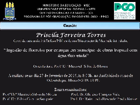 O programa de Pós-graduação em Odontologia da Universidade Federal do Piauí tem a honra de convidá-los para a defesa da dissertação de mestrado da aluna Priscila Ferreira Torres intitulada "Ingestão de Fluoretos por crianças em município de clima tropical com água fluoretada". O evento ocorrerá em sessão pública no dia 27 de fevereiro de 2015, às 08:30h no Auditório do Curso de odontologia da UFPI, Bloco Sg10. A banca será composta pelos professores doutores: Marcoeli Silva Moura (orientadora), Raimundo Rosendo Prado Junior, Fábio Correia Sampaio (membro externo) e Gláuber Campos Vale.