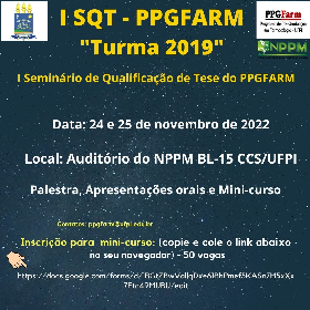 O Programa de Pós-Graduação em Farmacologia do Centro de Ciências da Saúde da Universidade Federal do Piauí, irá realizar nos dias 24 (manhã) e 25 (manhã e tarde) de novembro de 2022 o Seminário de Qualificação de Tese I - I SQT do PPGFARM "turma 2019", que deveria ter sido realizado em 2020/2021 e ficou compromometido em função da pandemia (covid-19).Teremos no dia 24 as 09h a palestra "Métodos aplicados na avaliação mutagênica e genotóxica de produtos naturais", minstrada pelo Prof. Dr. Joubert Aires de Sousa - UESPI. O Prof. Jourbert Aires foi nosso primeiro egresso do mestrado. Logo em seguida, teremos as 10h, teremos as apresentações de discentes: Priscyla Mª V. Mendes - "Efeito relaxante da filacantona na contratilidade uterina de roedores". Orientadora: Profa. Dra. Rita de Cássia Meneses Oliveira e as 10:30min - Deyna Francélia Andrade Próspero " Investigação da atividade aninociceptiva do isopulegol em modelos animais de dor neuropática". Orientadora: Profa. Dra. Fernanda Regina de Castro Almeida. Já no dia 25 teremos um mini-curso: "Análises de resultados usando o GraphPad Prism", ministrado pela Profa. Dra. Ana Flávia Seraine C. Viana, que também foi nossa egressa de mestrado. Serão dois dias de muito conhecimento. Participem!