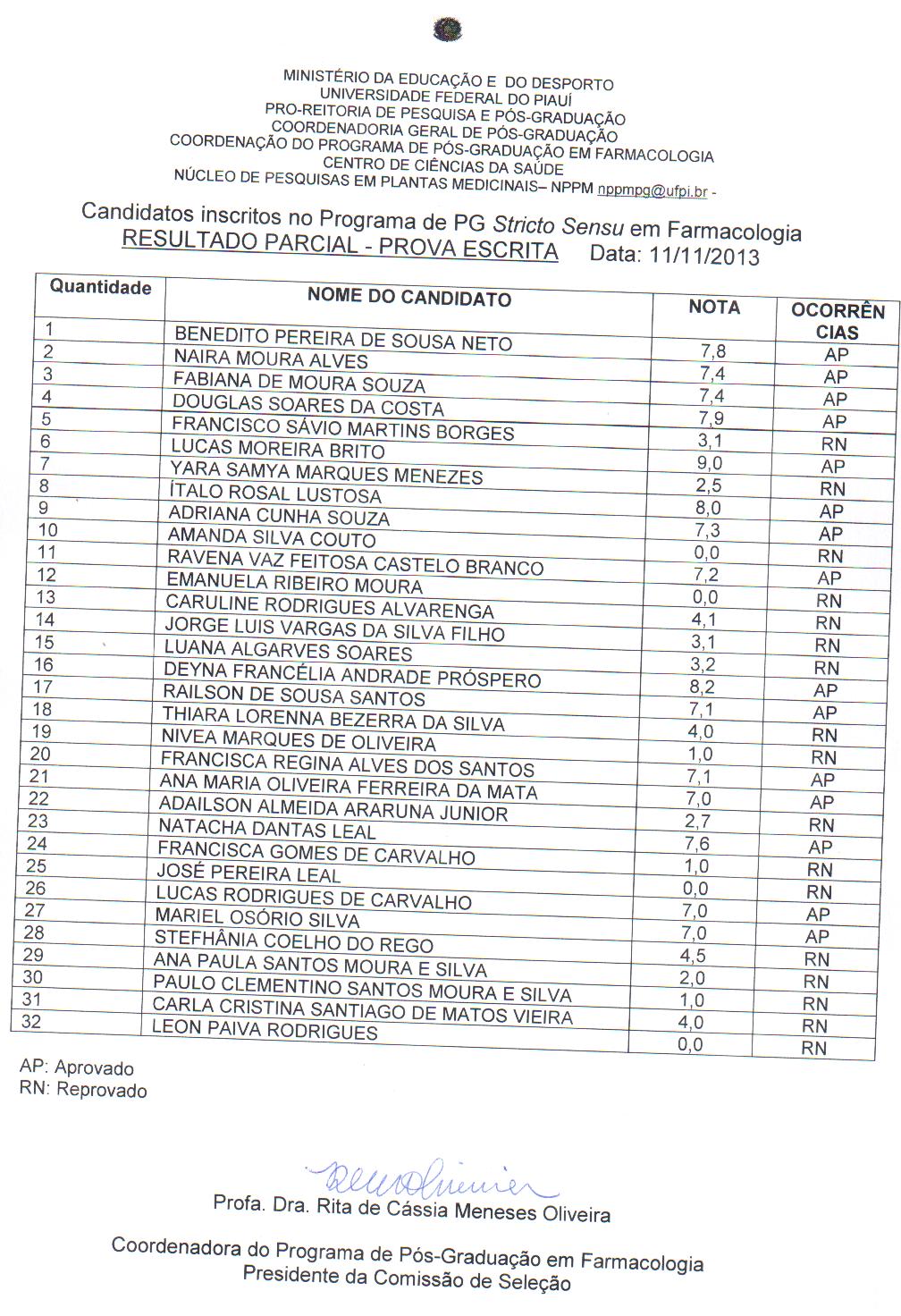 RESULTADO PROVA ESCRITA ROGRAMA DE PÓS-GRADUAÇÃO EM FARMACOLOGIA