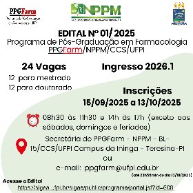 A Universidade Federal do Piauí (UFPI), por meio da Pró-Reitoria de Ensino de Pós-Graduação (PRPG), da Diretoria do Centro de Ciências da Saúde (CCS) e da Coordenação do Programa de Pós-Graduação em Farmacologia da UFPI, torna pública a abertura das inscrições e realização de seleção com vistas ao preenchimento de 12 vagas para mestrado e 12 vagas para doutorado, distribuídas nas linhas de pesquisa (Anexo I do edital) da área de Farmacologia, para ingresso no primeiro período de 2026.1.