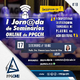 Abertas para o público em geral as inscrições para a 18a. Palestra da I Jornada de Seminários Online do PPGCM a ser realizada na próxima quinta, às 18 horas, via Live do Youtube, sendo este Seminário ministrado pela Profa. Dra. Dinnara Layza Souza da Silva, docente da UESPI, cujo título é "Perspectivas da Utilização da Tecnologia de Plasma na Agricultura", dia 17/09/2020.