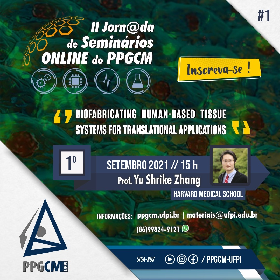 Abertas para o público em geral as inscrições para a 1a. Palestra da II Jornada de Seminários Online do PPGCM a ser realizada na próxima quarta-feira, às 15 horas, via Live do Youtube, sendo ministrado pelo Prof. Dr. Yu Shrike Zhang (Harvard Medical School / USA), cujo título é "Biofabricating Human-Based Tissue Systems for Translational Applications", dia 01/09/2021.