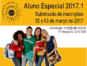 O Programa de Pós-Graduação em Sociologia torna público através deste o processo simplificado para ingresso de discentes em carater especial no período 2017.1 na 6ª Turma de Mestrado em Sociologia, o processo de seleção se dará conforme regulamentação da resolução 01.2013 - PPGS, onde, o candidato/a se apresentará presencialmente ou atraves de um procurador/a com documentos originais e cópias na coordenação do PPGS sala 308B-Centro de Ciências Humanas e Letras-CCHL-UFPI afim de pleitear vaga no processo, conforme a lista da documemntação exigida: