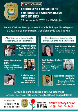 O Programa de Pós-graduação em Sociologia da Universidade Federal do Piaui - UFPI convida a todos a participarem de uma Roda de Diálogo Abordagens e Desafios do Feminicidio: transformando luto em luta prromovido pela Policia Civil do Piauí e que contará com a participação da docente da linha de Gênero e Geração do PPGS, Profª Drª Rossana Maria Marinho Albuquerque.