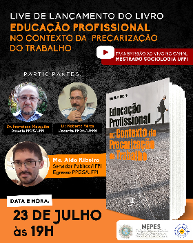 O Programa de Pós-graduação em Sociologia (PPGS) da Universidade Federald do Piauí (UFPI), convida a todos para o lançamento on-line do livro “Educação Profissional no Contexto da Precarização do Trabalho”, escrito por Aldo Vieira Ribeiro, egresso do PPGS/UFPI e Técnico em Assuntos Educacionais do Instituto Federal do Piauí (IFPI). O lançamento acontecerá nesta sexta-feira (23), às 19h, pelo canal do PPGS no Youtube. Para acompanhar, clique AQUI.