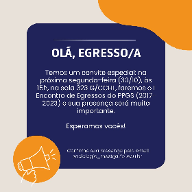 Então, temos um convite especial para te fazer: na próxima segunda-feira (30/10), das 15h às 17:30h, na sala de aula 323G/CCHL, será realizado o I Encontro de Egressos do PPGS (2017-2023), que tem como objetivo articular atividades e fortalecer os vínculos com os/as pesquisadores que fizeram parte do programa. Sua presença será muito importante para nós!