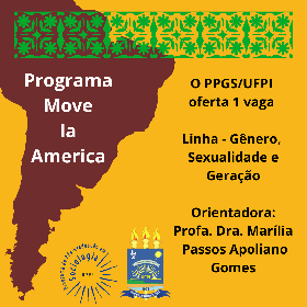 O Programa de Pós-Graduação em Sociologia da Universidade Federal do Piauí (PPGS/UFPI) foi contemplado pelo Programa Move La America (Edital CAPES n. 07/2024), com uma bolsa para discente estrangeire da América Latina e Caribe. Interessades devem apontar sua escolha pelo PPGS, com vinculação a Linha Gênero, Sexualidade e geração, no Brasil contando com a coorientação da professora Dra. Marília Passos Apoliano Gomes. A referida docente tem atuado principalmente com as seguintes temáticas: Interseccionalidade; Gênero e raça no Brasil; Decolonialidade e contracolonialidade; Direitos humanos e movimentos sociais; Sociologia Urbana e direito à cidade; Memória, identidade e território; Ensino de Sociologia. Atualmente desenvolve pesquisas nas áreas de Feminismos afrodiaspóricos, Memória e Direitos Humanos. E-mail para contato: mariliapassos@ufpi.edu.br