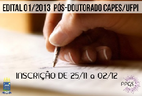 Viemos tornar público atraves desta noticia a abertura de 01 vaga para bolsista de pós-doutorado (Programa Nacional de Pós-Doutorado da CAPES/2013), em anexo edital para o processo seletivo mais informações: 3215-5697 ou através do e-mail: sociologia_mest@ufpi.edu.br inscrições abertas no período de 25/11 a 02/12 formulario de incrição aqui >>> http://www.sigaa.ufpi.br/sigaa/public/programa/documentos.jsf?lc=pt_BR&id=614&idTipo=4