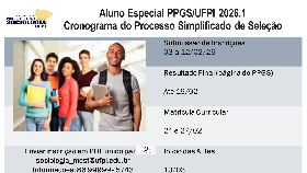 O Programa de Pós-graduação em Sociologia - PPGS da Universidade Federal do Piauí - UFPI torna publico o Processo Seletivo Simplificado para o/as interessado/as em ingressar no periodo 2026.1 como aluno/as em caráter especial do Mestrado, podendo matricular-se em até duas (02) disciplinas.
